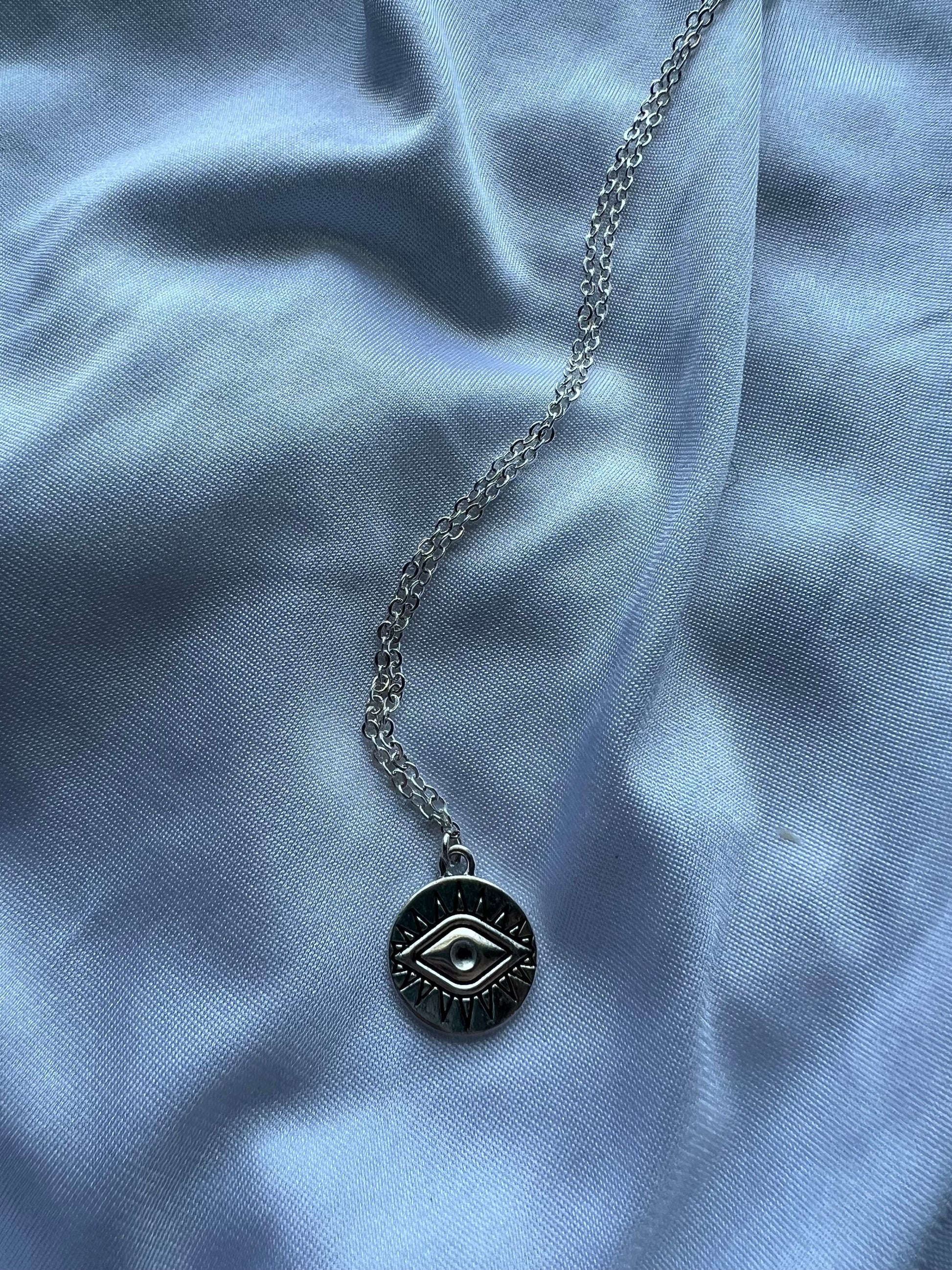 This circular eye necklace is crafted from silver-plated solid brass and is lead and nickel free. It is specially treated to provide anti-tarnish protection, making it a durable and versatile accessory for any occasion.
